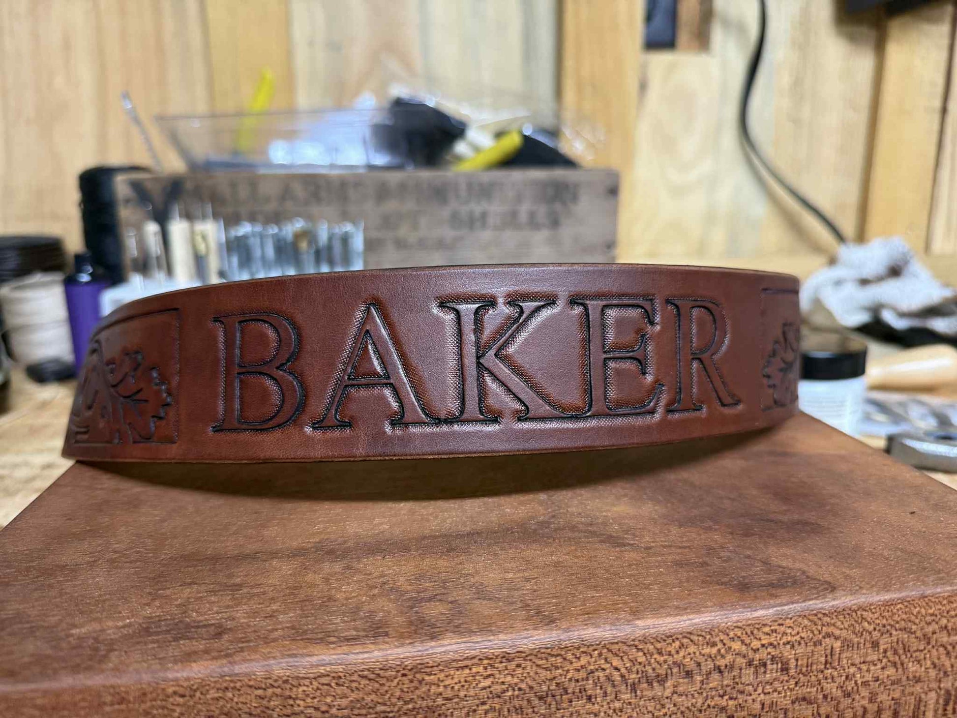 • Design: Hand-tooled oak leaves, feathers, and personalized last name